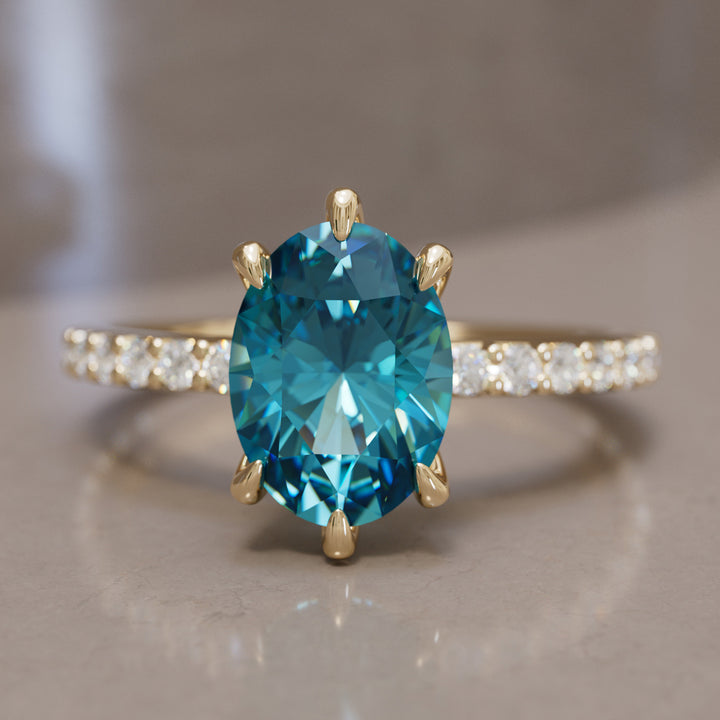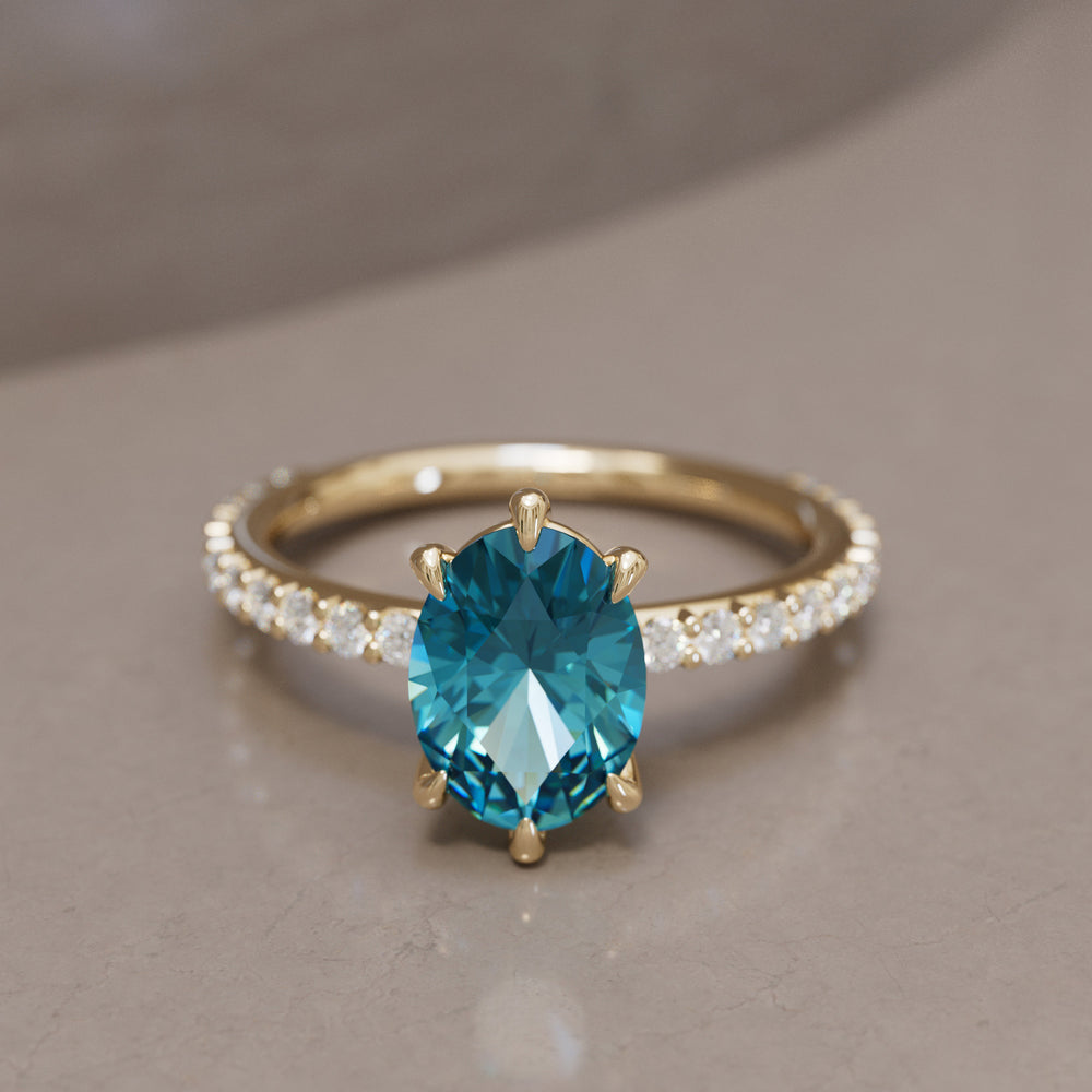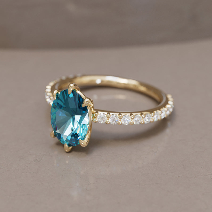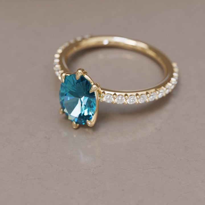 La bague de fiançailles Cybele est une bague de fiançailles classique et sophistiquée en saphir ovale. Le saphir bleu central est habilement serti de griffes et le bracelet scintille sous tous les angles avec de minuscules diamants le long des trois quarts du bracelet. Les diamants de style pavé mesurent 1,5 mm/0,015 ct avec un total de 0,33 ct.