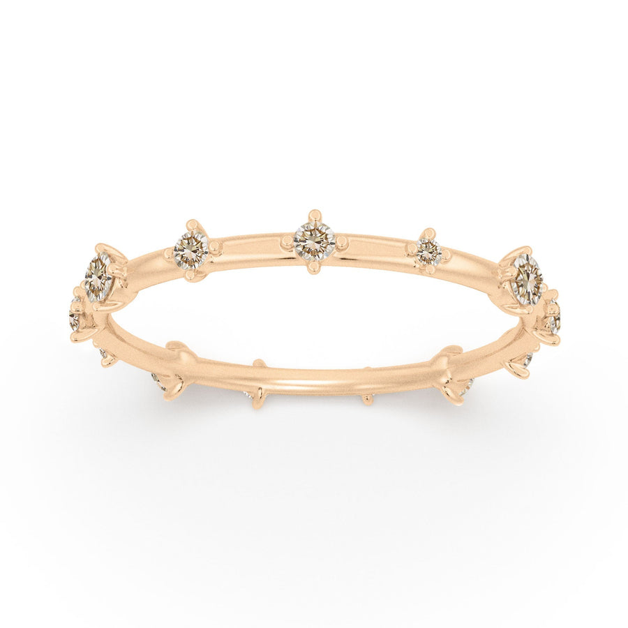 Une nouvelle interprétation de la classique alliance éternelle, la Bague Galaxy est une bague constellation empilable avec un arrangement asymétrique de diamants champagne éthiques suspendus sur une bande en or. Les pierres sont serties dans de l'or massif fairmined à finition satinée. La Bague Galaxy est une alliance de mariage unique parfaite ou une bague d'anniversaire au style minimaliste. Le poids total en carats des diamants champagne est de 0,231 Cts.