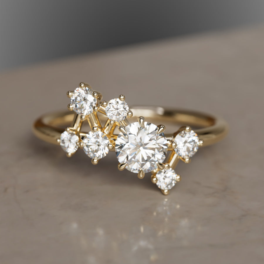 Présentation de la bague en diamant cultivé en laboratoire Andromeda, un chef-d'œuvre céleste inspiré par le cosmos. Cette bague unique en grappe présente des diamants cultivés en laboratoire taille brillant disposés en une silhouette captivante, avec un diamant cultivé en laboratoire de 4,5 mm et 0,37 carats au centre, pour un total de 0,67 carats de diamants.