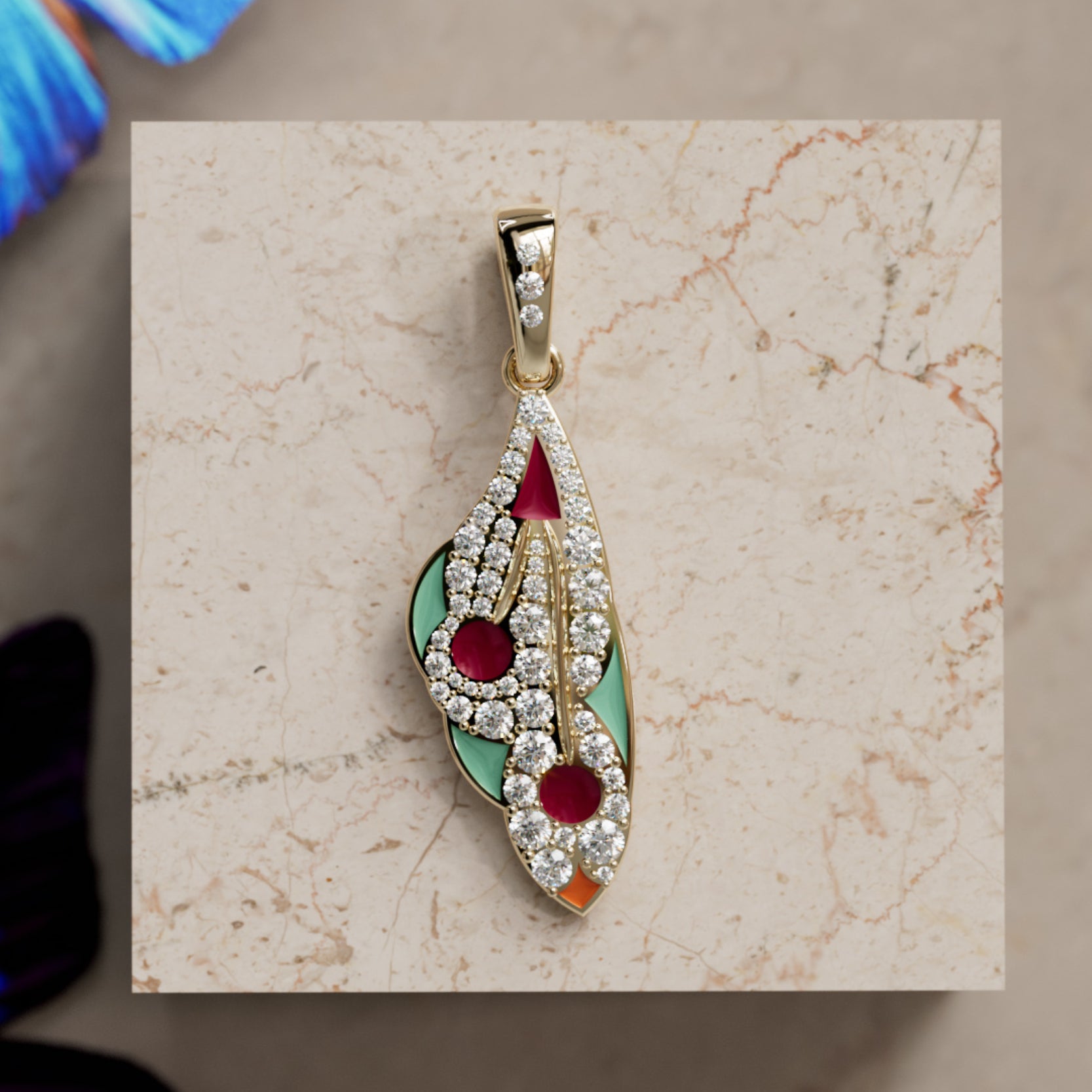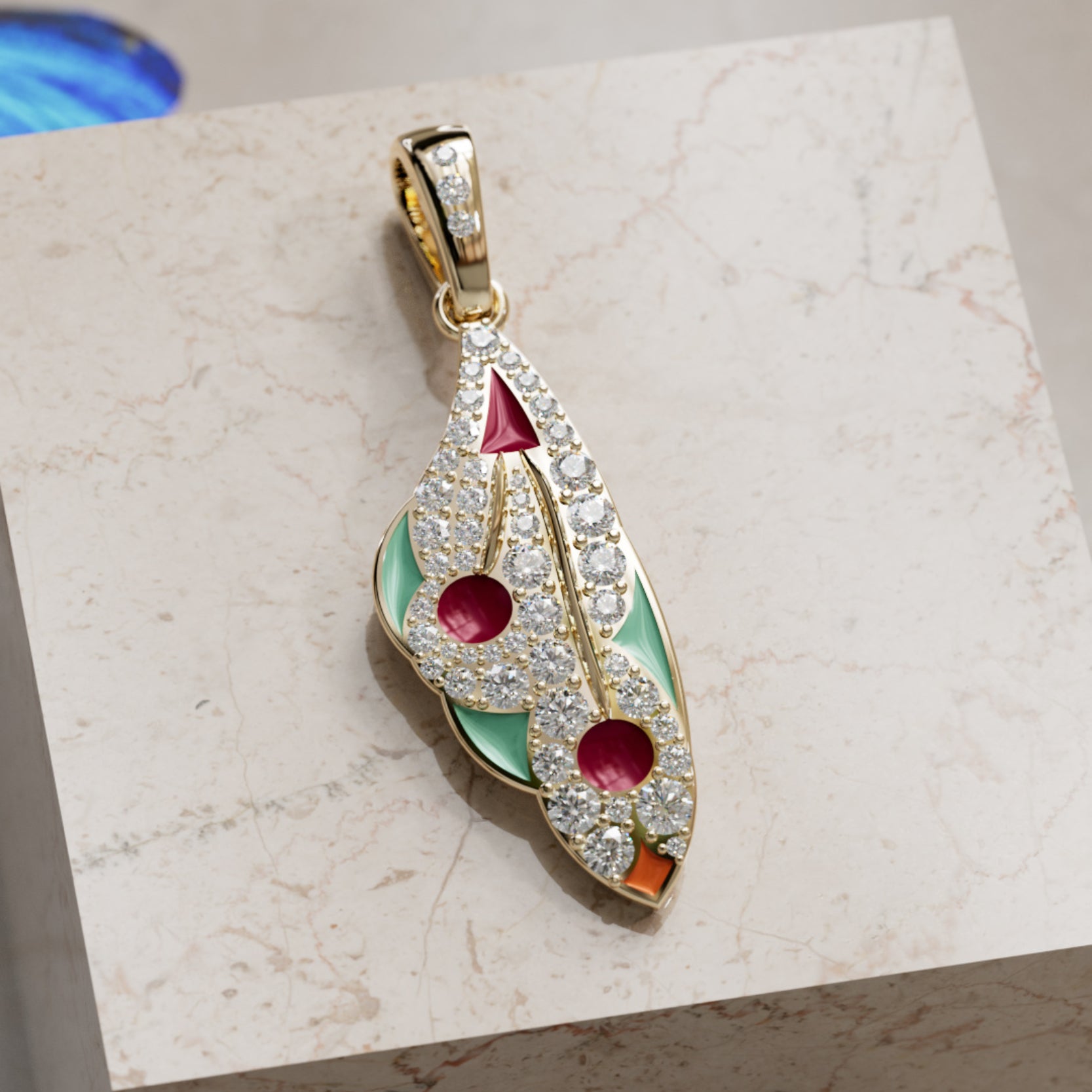 Innblásin af því dásamlegasta veru allra, fiðrildinu, táknar það umbreytingu, von og endurfæðingu. Glæsilegur gjöf fyrir þig sjálfan eða einhvern sem þú elskar, þessi hengiskraut er fullkominn yfirlýsingarhlutur til að minnast á áfanga. Í litunum Merlot og Malachite Blue, með merlot rauðum, malakítgrænum og graskersappelsínugulum. Þessi einstaka hengiskraut er handunnið eitt í einu með vandlega máluðu emalí, þínu vali á málmlit og gervi demöntum. Heillinn er 30 mm langur með heildar karataþyngd 0,86 cts og heildar gullþyngd í 14k er 6 grömm. Keðjan er seld sér.