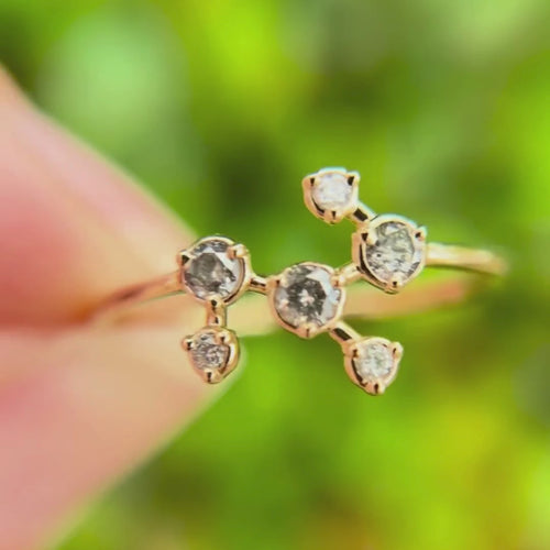 Presentiamo l'Anello Pleiadi, un capolavoro celeste ispirato alla bellezza dell'ammasso stellare delle Pleiadi. Questo anello concettuale a costellazione è perfetto per un anello di fidanzamento unico ispirato al cosmo. Realizzato con cura, presenta diamanti color sale e pepe in un design a costellazione incastonato in oro fairmined. L'Anello Pleiadi è più di un semplice gioiello; simboleggia la guida divina e incarna la magia del cosmo. Anello fuso in oro giallo, oro rosa o oro bianco fairmined 14k e ha .225 carati totali di diamanti.