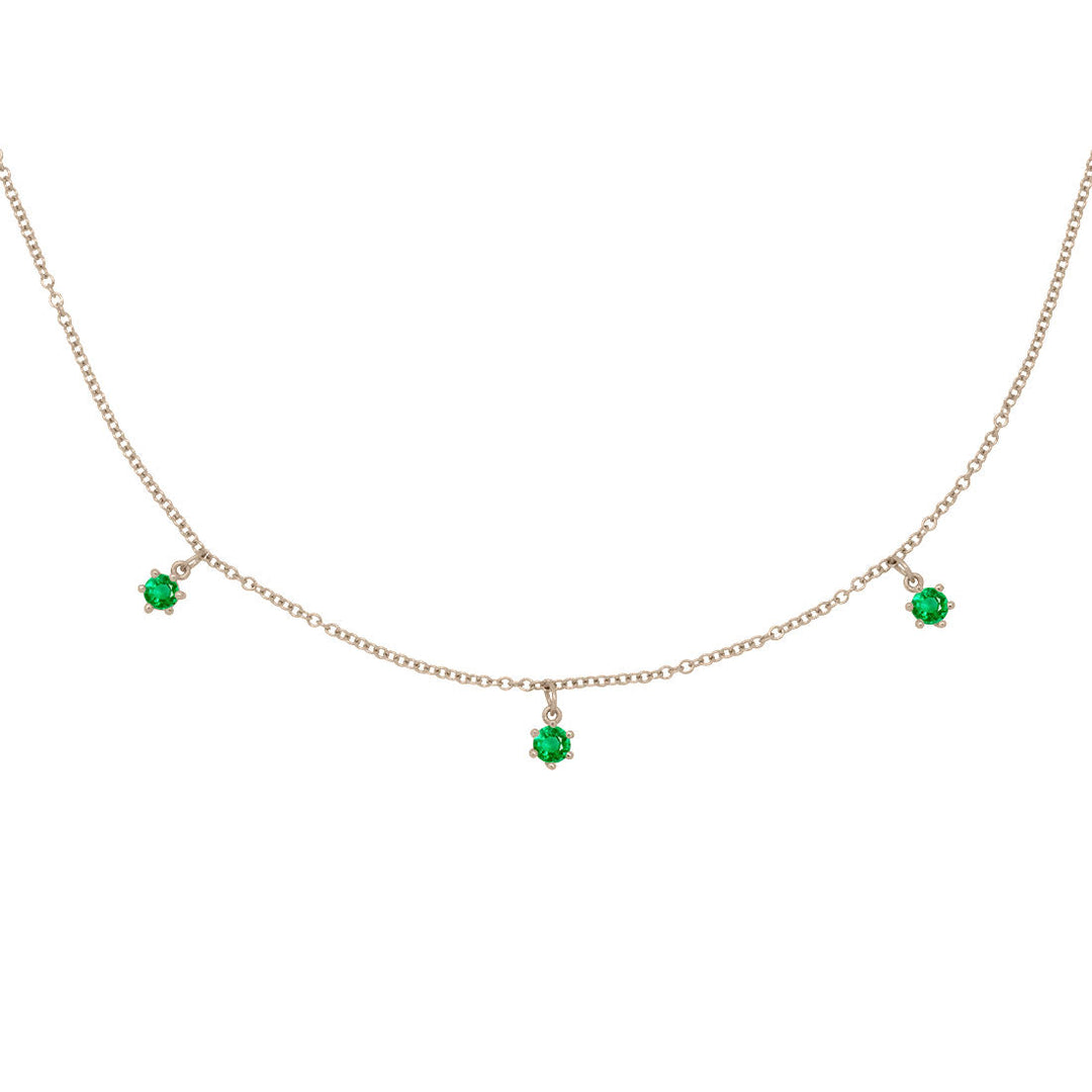 Gli smeraldi etici adornano una delicata catena ispirata alla dea del verde, Demetra. I ciondoli di smeraldo hanno un bellissimo movimento e scintillio. La lunghezza della catena è di 18" in totale. Le pietre sono da 0,1 carati, 0,30 carati in totale. Le pietre sono smeraldi brasiliani di prima qualità con un profondo colore verde petrolio ricco, provenienti da fonti etiche. La catena è certificata fairmined solo in oro giallo. Le catene in oro rosa e oro bianco sono in oro convenzionale. Tutti i ciondoli sono fusi in oro giallo, rosa o bianco certificato fairmined.