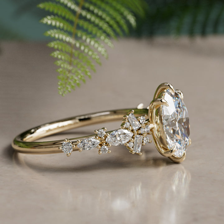 Anello di fidanzamento unico Philomena ovale con diamante da laboratorio ispirato alla natura