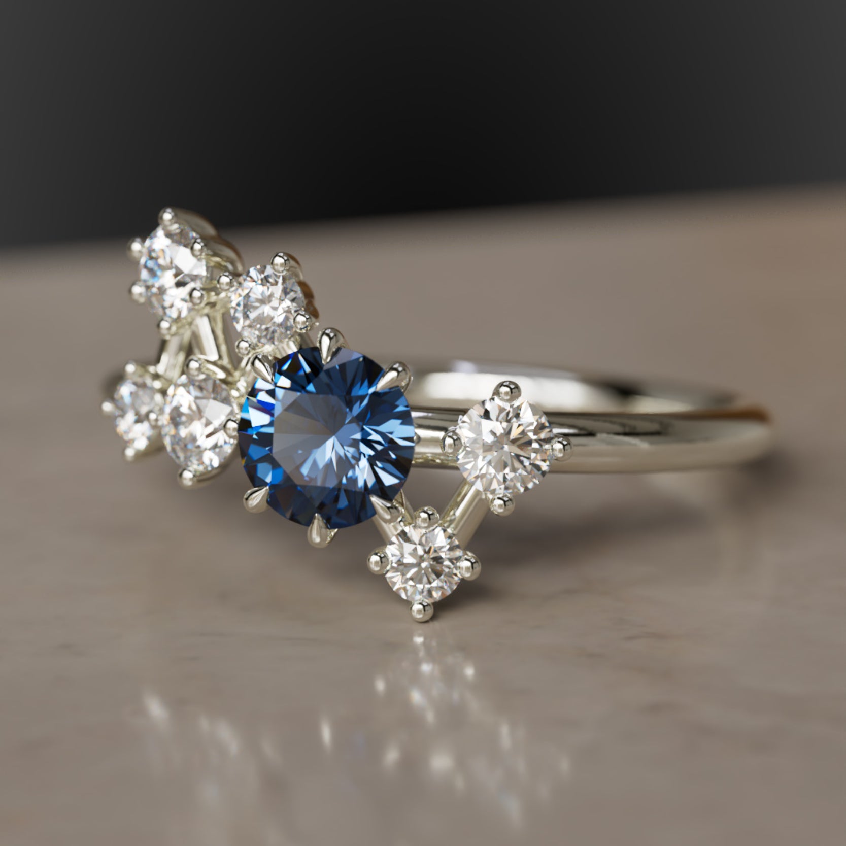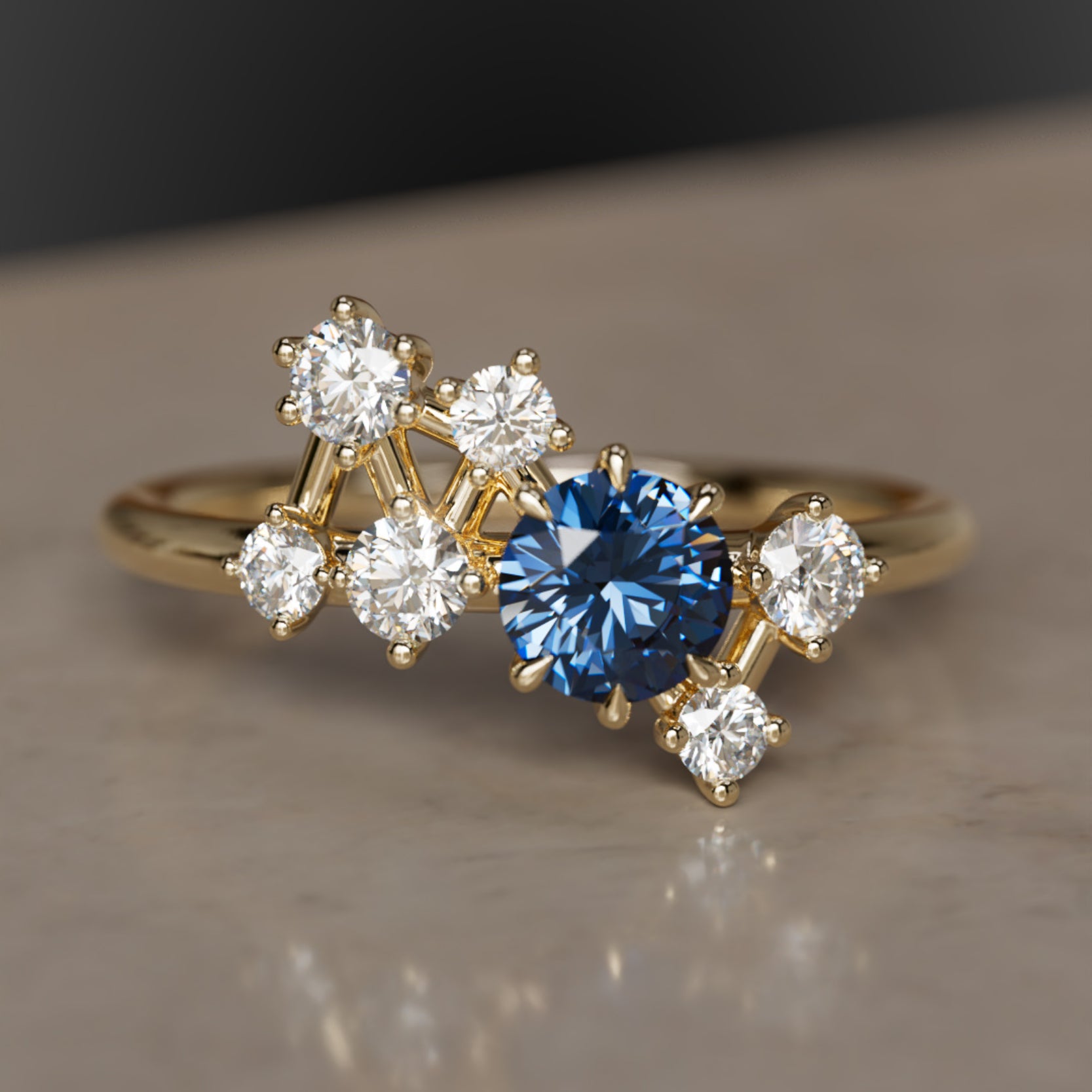 Presentiamo l'Anello Andromeda Sapphire, un capolavoro etereo ispirato alla galassia di Andromeda. Questo anello a grappolo celeste presenta diamanti coltivati in laboratorio disposti in una forma celeste affascinante, con un ipnotico zaffiro blu da 4,5 mm al centro. Eleva il tuo stile e abbraccia la bellezza del cosmo con questo pezzo unico e incantevole.