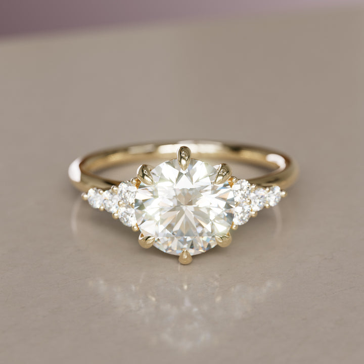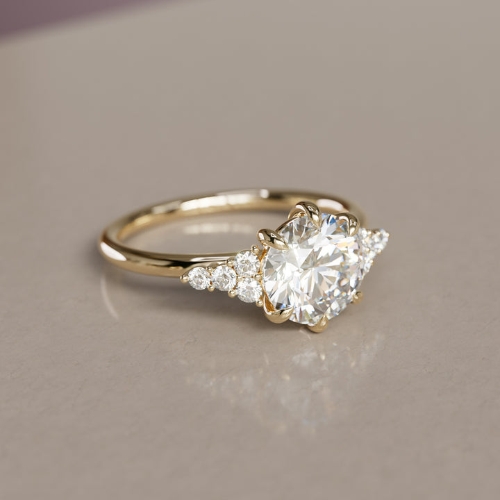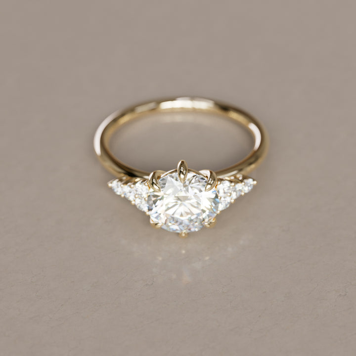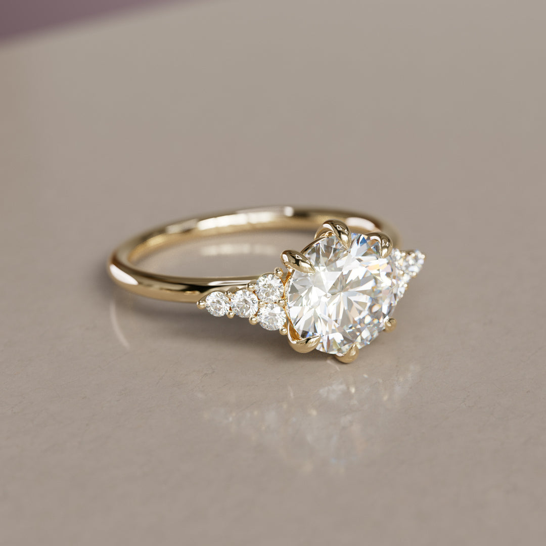 De Iris verlovingsring is een elegant, door de natuur geïnspireerd ontwerp met taps toelopende clusters van zijdiamanten. Deze ronde verlovingsring heeft een duurzame centrale ronde geslepen labdiamant met klauwzettingen en prachtige accentdiamanten die een unieke flatterende silhouet creëren.