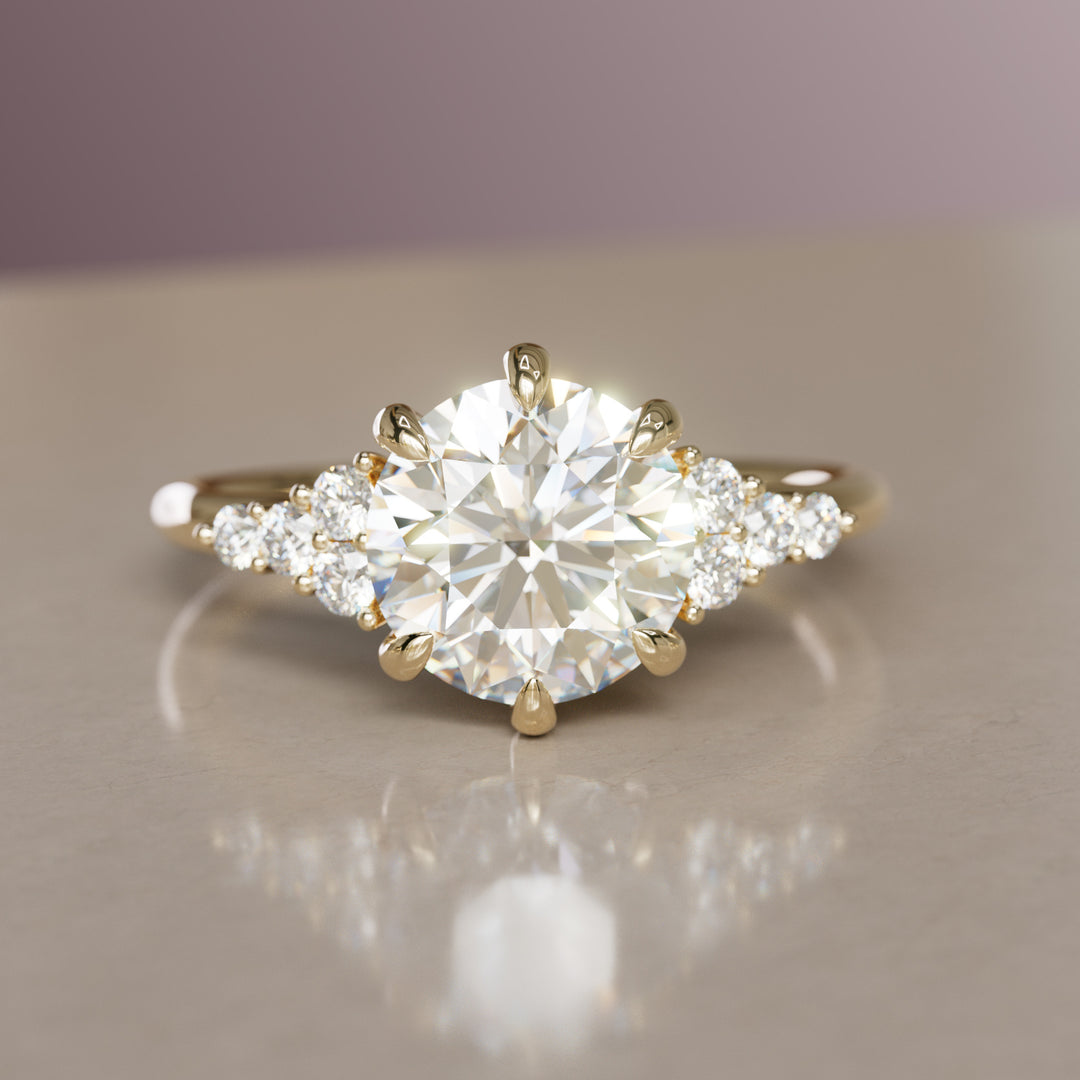 Center lab diamant in voorbeeld 1,5 ct en H+ VS1+ kwaliteit. GIA, IGI, of GCAL gecertificeerd. Zij ronde lab diamanten zijn in totaal 0,19 ct. We betrekken onze centrale lab diamanten van Carbon Capture Lab Diamond gemaakt van luchtvervuiling en van SCS duurzaam beoordeelde lab diamanten.