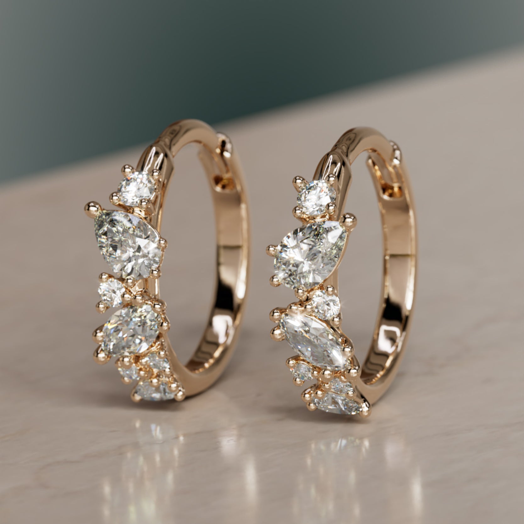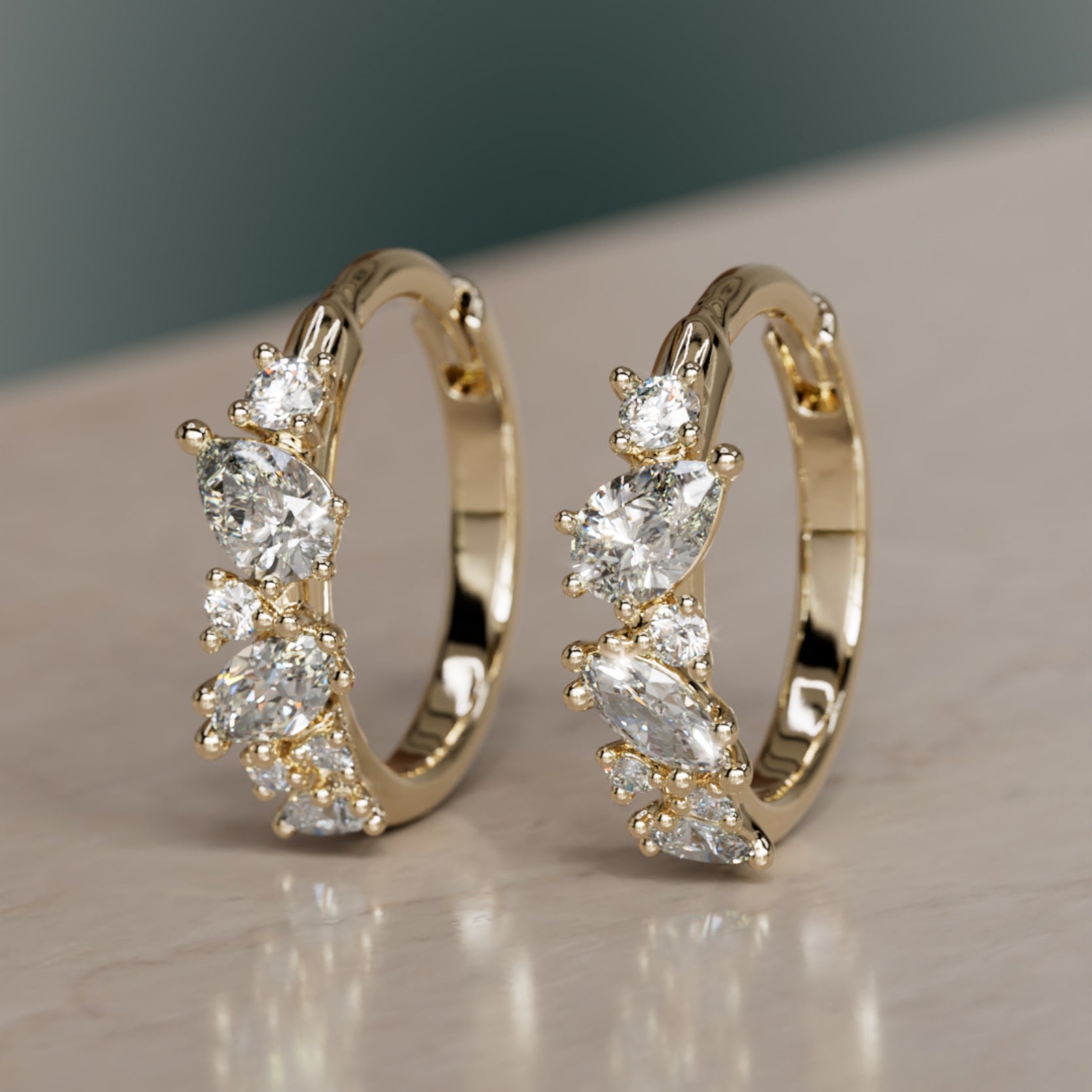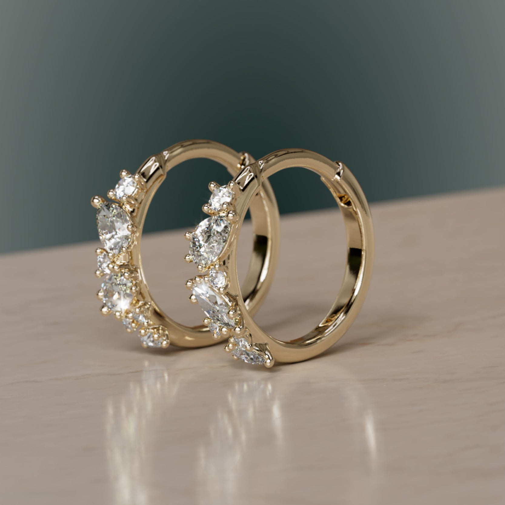 De Mélange clicker hoops zijn een elegante dagelijkse must-have en hebben een gemengd collageontwerp van peer-, marquise- en ronde diamanten die langs de rand van een moderne 14k gouden clicker-hoop zijn gezet. Deze oorbellen sluiten met een scharnierende clicker-sluiting. Voor een naadloze ring van alle kanten zijn clickers de gemakkelijkste oorbellen om elke dag te dragen. Het totale diamantgewicht voor het paar is 0,32 karaat. De binnenkant van de ring meet ongeveer 12 mm voor de perfecte ringoorbel-look.