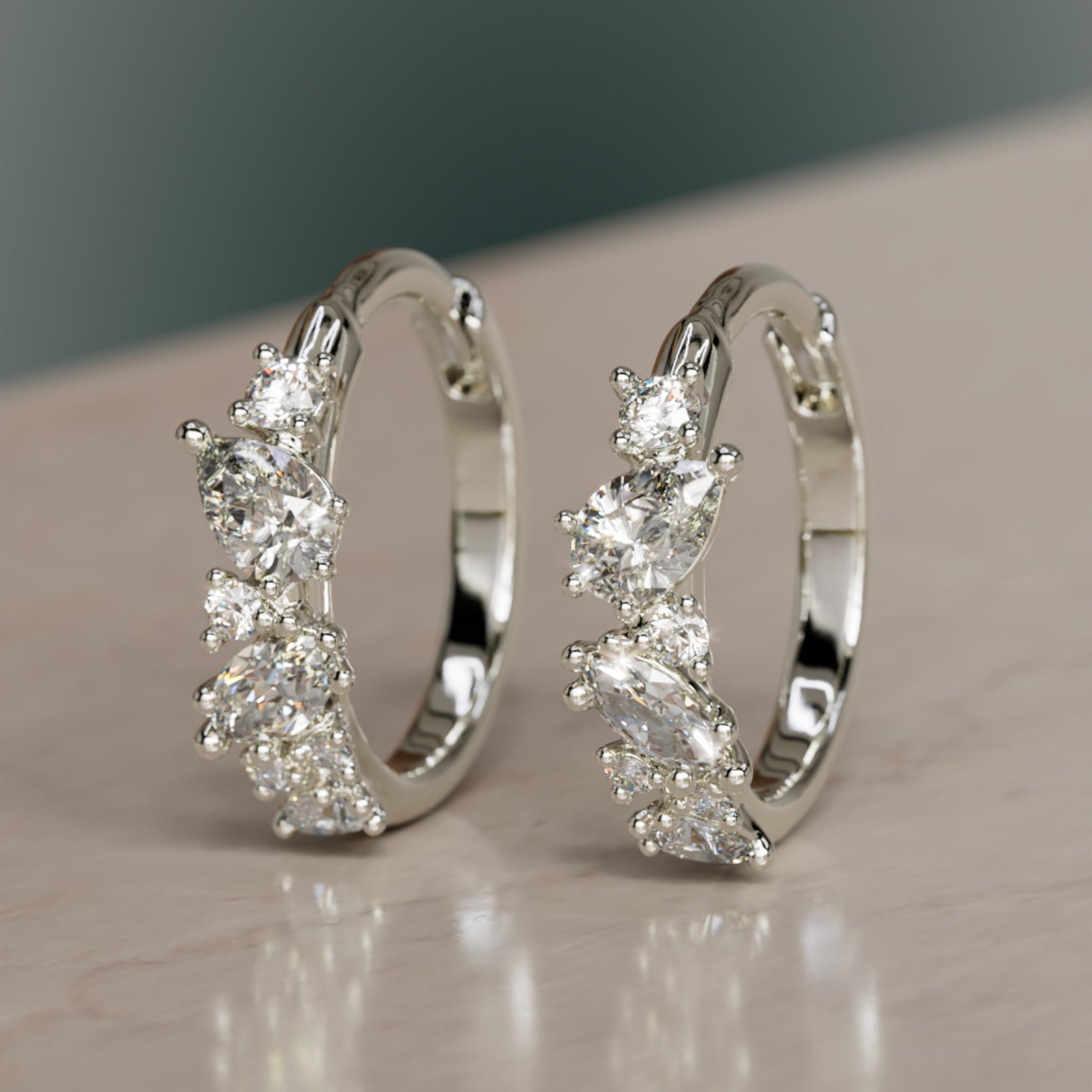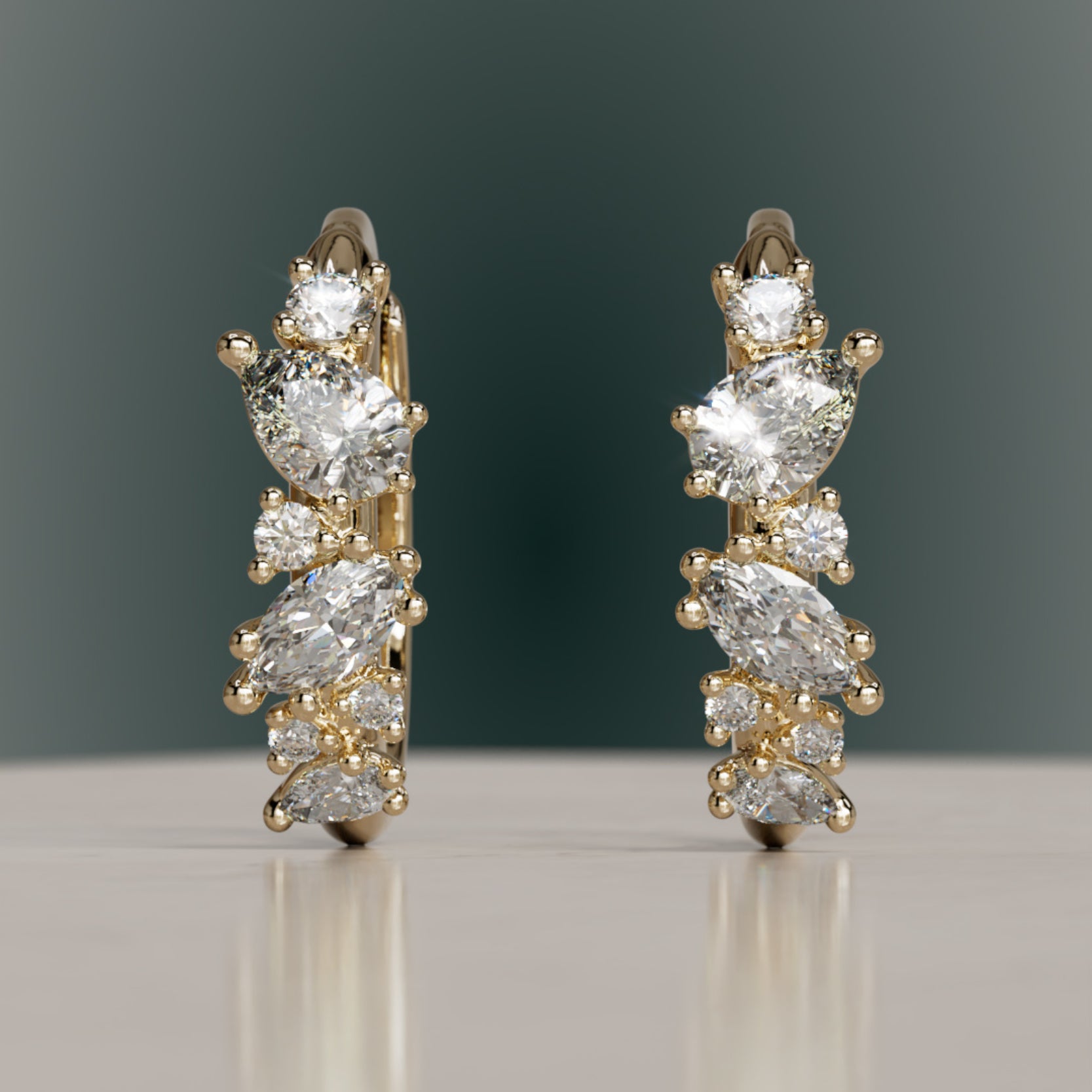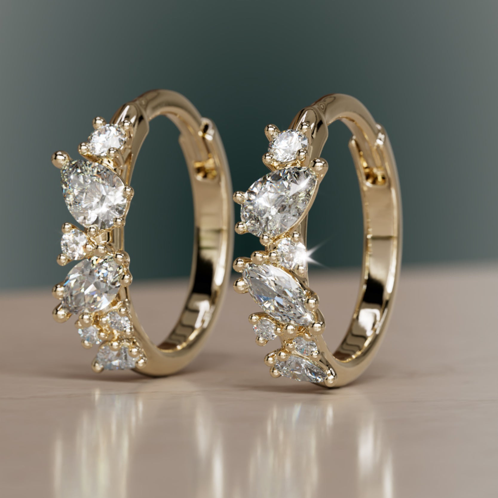 De Mélange clicker hoops zijn een elegante dagelijkse must-have en hebben een gemengd collageontwerp van peer-, marquise- en ronde diamanten die langs de rand van een moderne 14k gouden clicker-hoop zijn gezet. Deze oorbellen sluiten met een scharnierende clicker-sluiting. Voor een naadloze ring van alle kanten zijn clickers de gemakkelijkste oorbellen om elke dag te dragen. Het totale diamantgewicht voor het paar is 0,32 karaat. De binnenkant van de ring meet ongeveer 12 mm voor de perfecte ringoorbel-look.