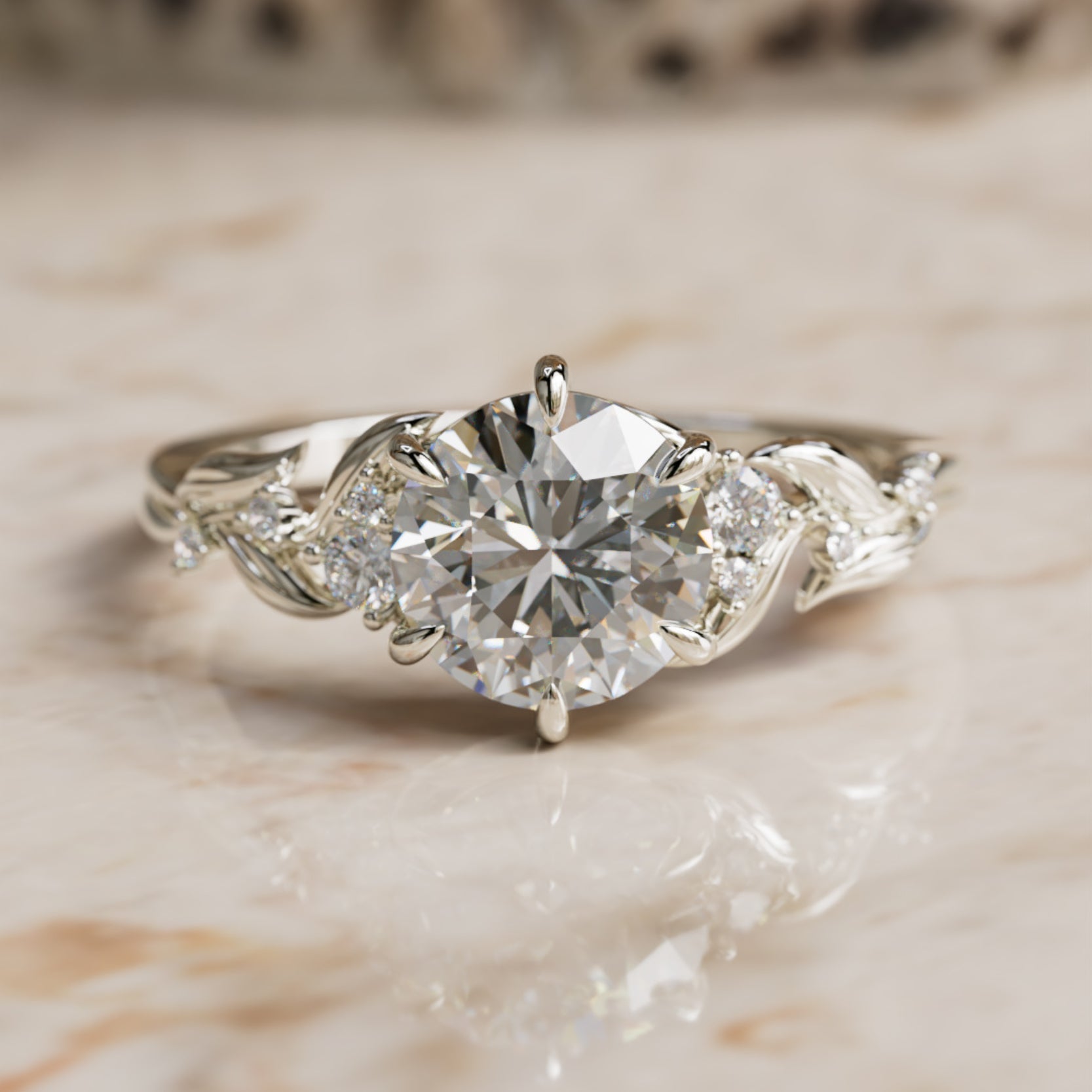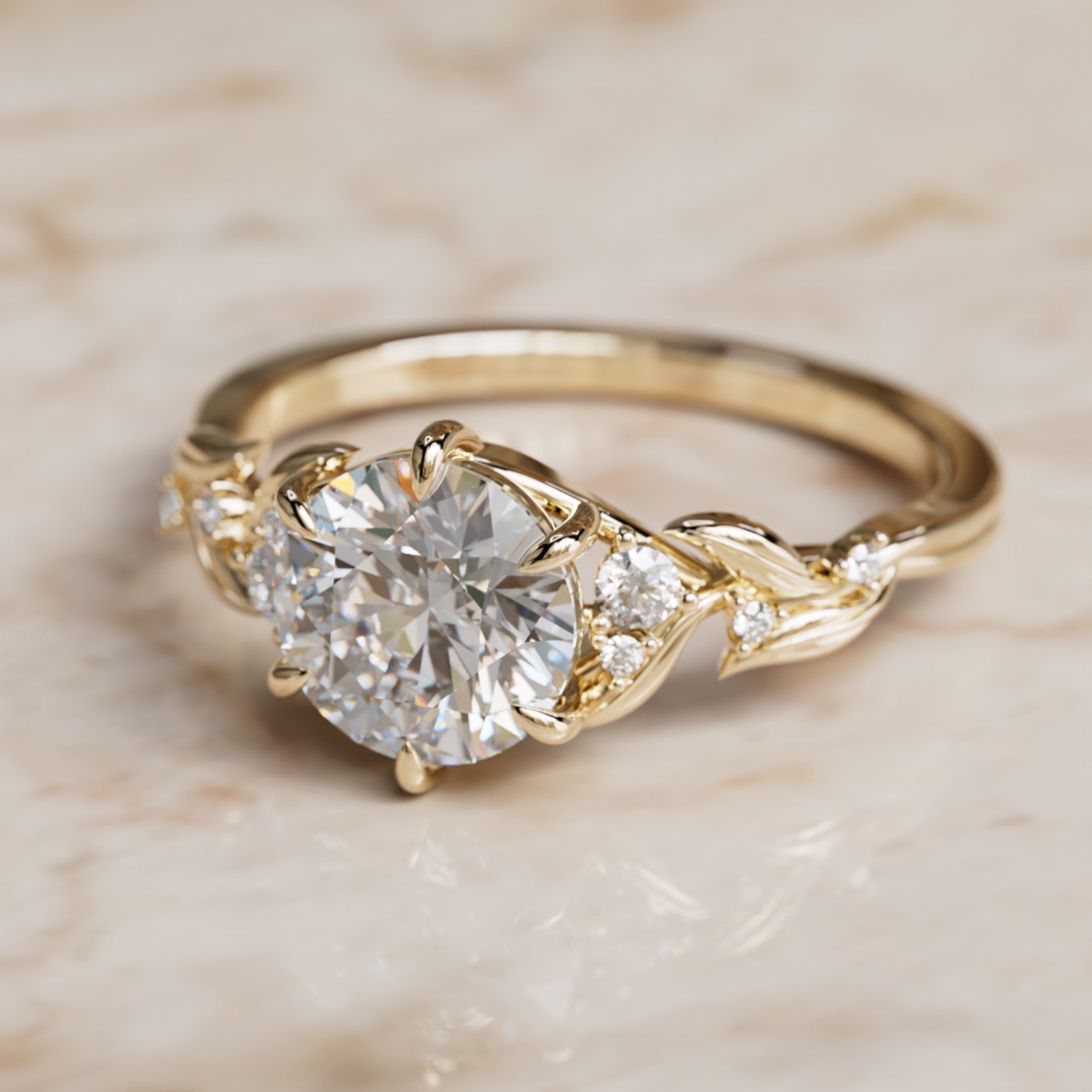 Et art nouveau-eventyr, denne naturinspirerte forlovelsesringen er designet med elegante bladmønstre og diamantdetaljer. En fantastisk rundslipt laboratoriediamant står i sentrum, og er perfekt fremhevet av fantasifulle detaljer for en virkelig romantisk forlovelsesringsinnfatning. Smigrende og unik vil Celria-ringen gjøre ethvert frieri uforglemmelig. Størrelsen på midtsteinen i eksempelet er rundt 1,5 ct. Side-laboratoriediamanter er totalt 0,08 ct og av VS1+ kvalitet.