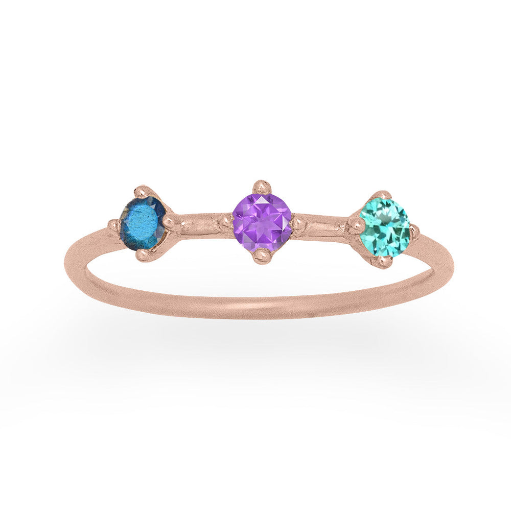 Ten emblemowy pierścień prezentuje kamienie szlachetne znaku Wodnika, które reprezentują energię tego znaku zodiaku dla osób urodzonych między 20 stycznia a 18 lutego. Kamień Wodnika to Iris Ametyst, planetą rządzącą jest Uran, reprezentowany przez Labradorit, a żywiołem jest Powietrze, reprezentowane przez turmalin teal. Kamienie pochodzą z etycznych źródeł i są ręcznie wybierane pod kątem koloru i jakości.