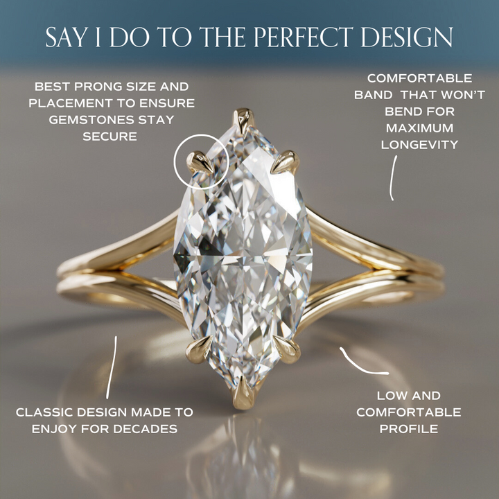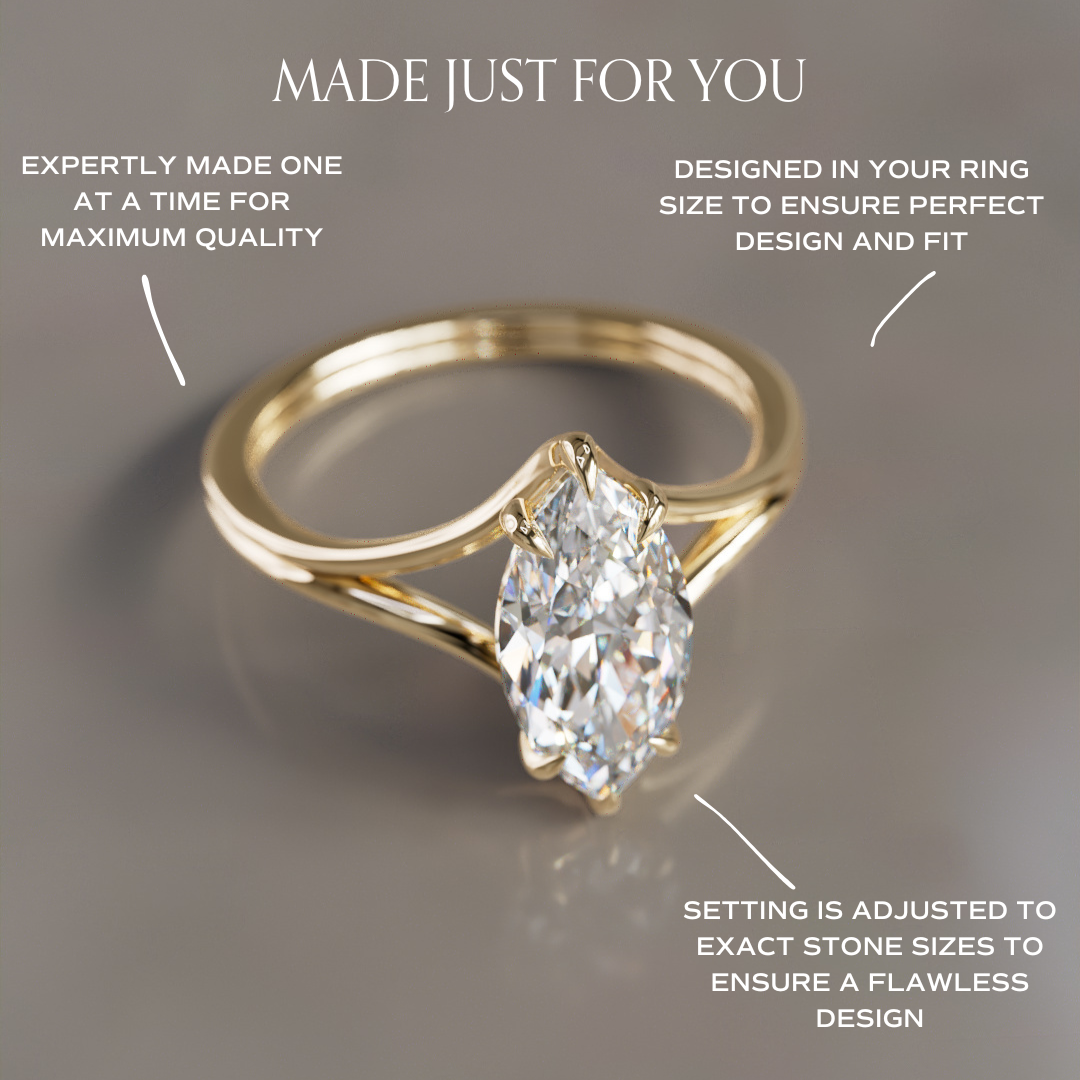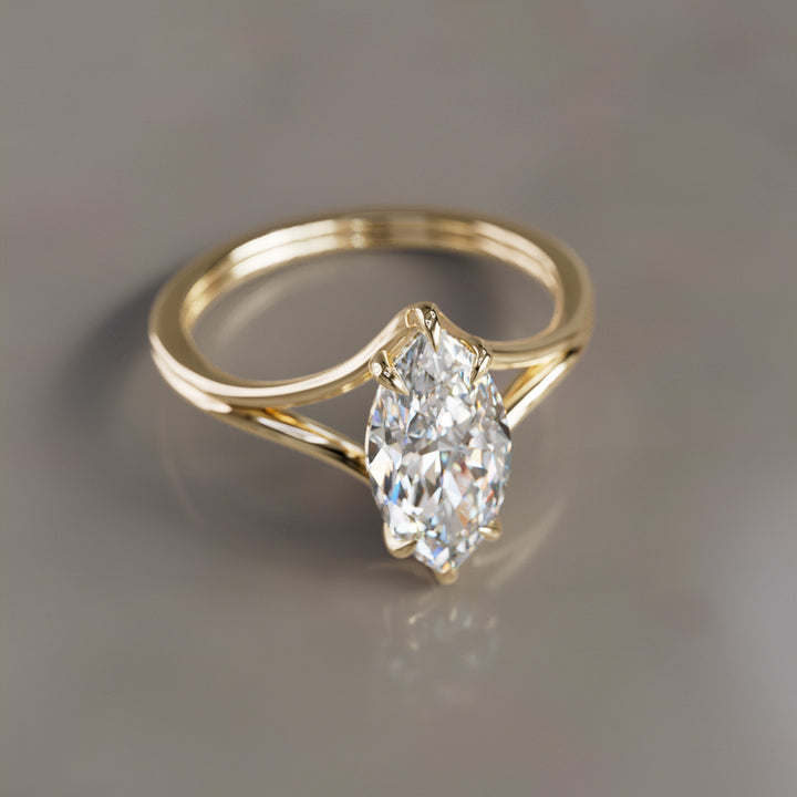Jakby wykuty w królestwie Elfów, pierścionek zaręczynowy Nova Marquise emanuje magią i wyjątkowością. Smukły, rozdzielony szlak tego pierścionka tworzy efekt unoszącego się diamentu, który będzie rozświetlał pomieszczenie. Centralny diament marquise jest pewnie osadzony na sześciu eleganckich łapkach. Obrączka wykonana jest z 14-karatowego złota fairmined o szerokości 1,7 mm u dołu.