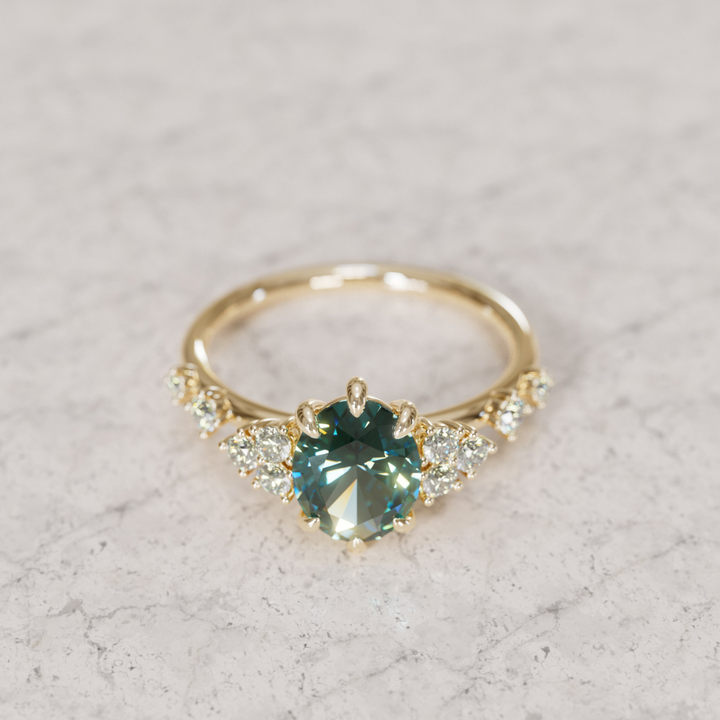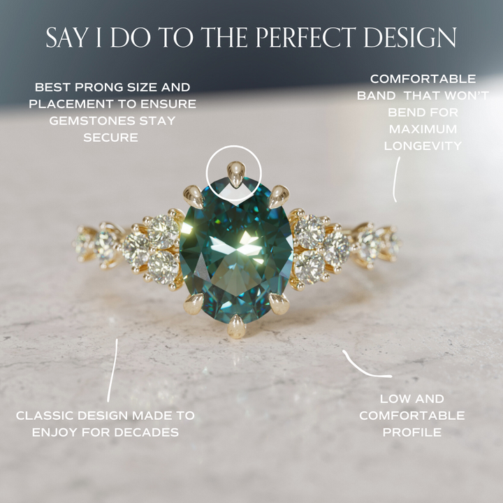 Inelul de logodnă Odelia îmbină estetica modernă cu basmele pline de farmec. Partea cerească și partea de fantezie, acest inel oval de logodnă prezintă un design personalizat safir oval teal accentuat de grupuri de diamante rotunde de laborator într-un design frumos conic. Diamantele rotunde laterale de laborator sunt în total 0,25 ct. Safirul oval central teal din exemplu are aproximativ 1,5 carate.