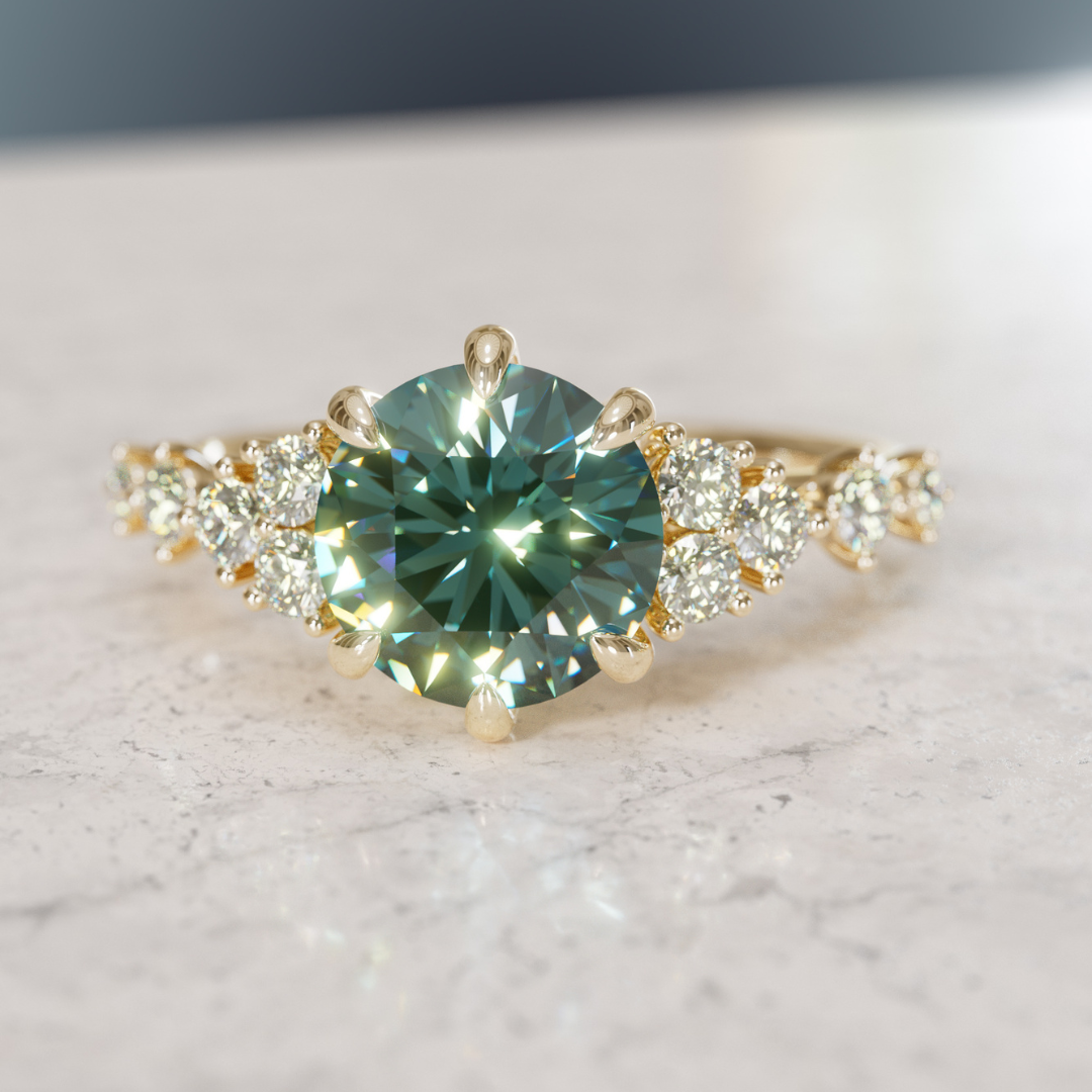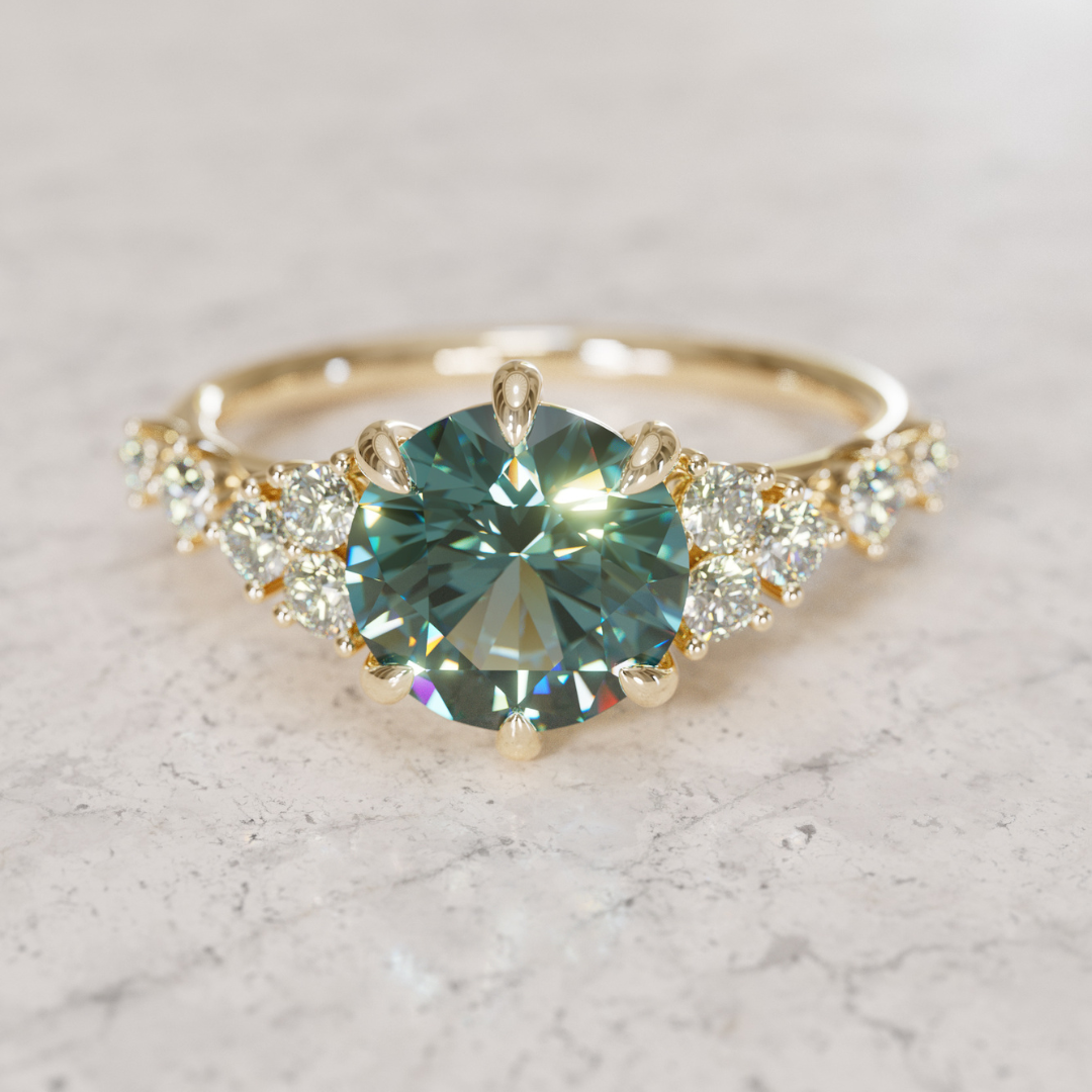 Inelul de logodnă Odessa îmbină estetica modernă cu basmele pline de fantezie. O parte cerească și o parte fantastică, acest inel de logodnă rotund prezintă un design personalizat safir teal rotund accentuat de grupuri de diamante rotunde de laborator într-un design frumos conic. Diamantele laterale rotunde de laborator sunt în total 0,25 ct. Safirul teal rotund central din exemplu are aproximativ 1,5 carate.