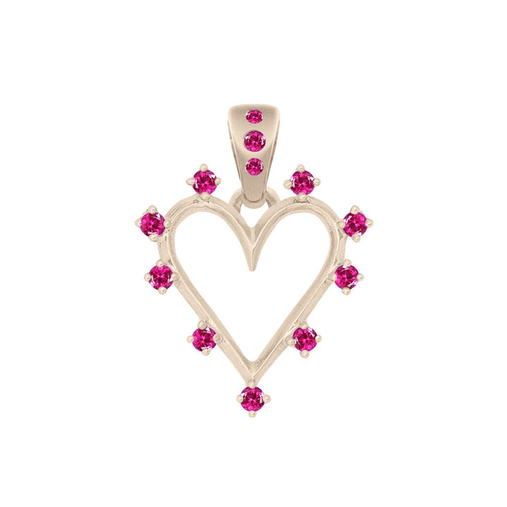 Charm-ul inimii măsoară 20mm. Lănțișorul se vinde separat. Stonele sunt rubine vietnameze de cea mai bună calitate, cu o culoare profundă și bogată, obținute etic, greutatea totală a rubinelor fiind de 0,21 carate. Poate fi personalizat cu diamante albe pe pandantiv.