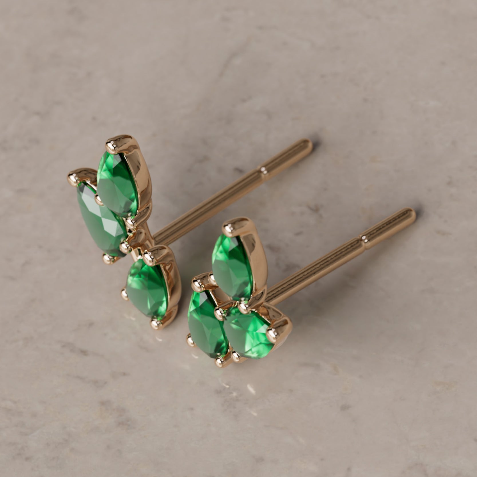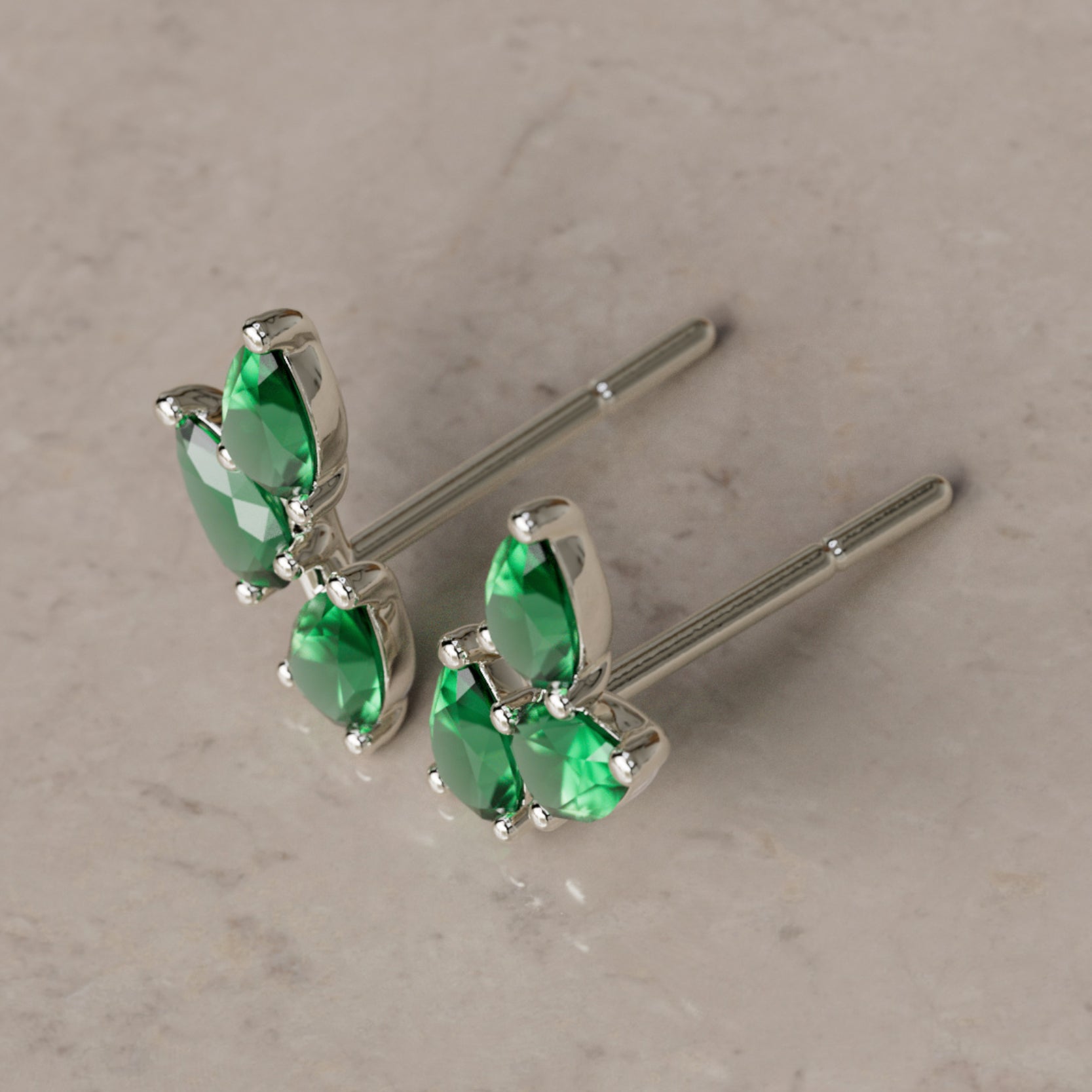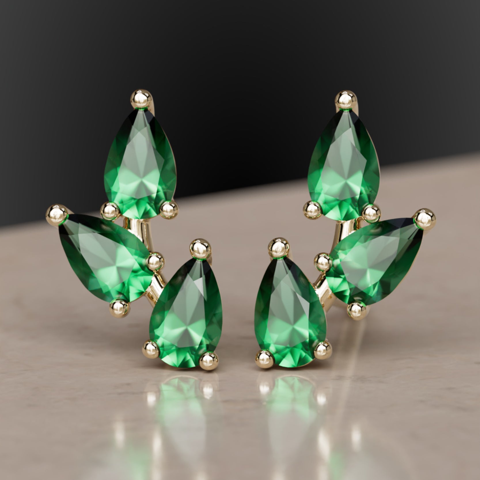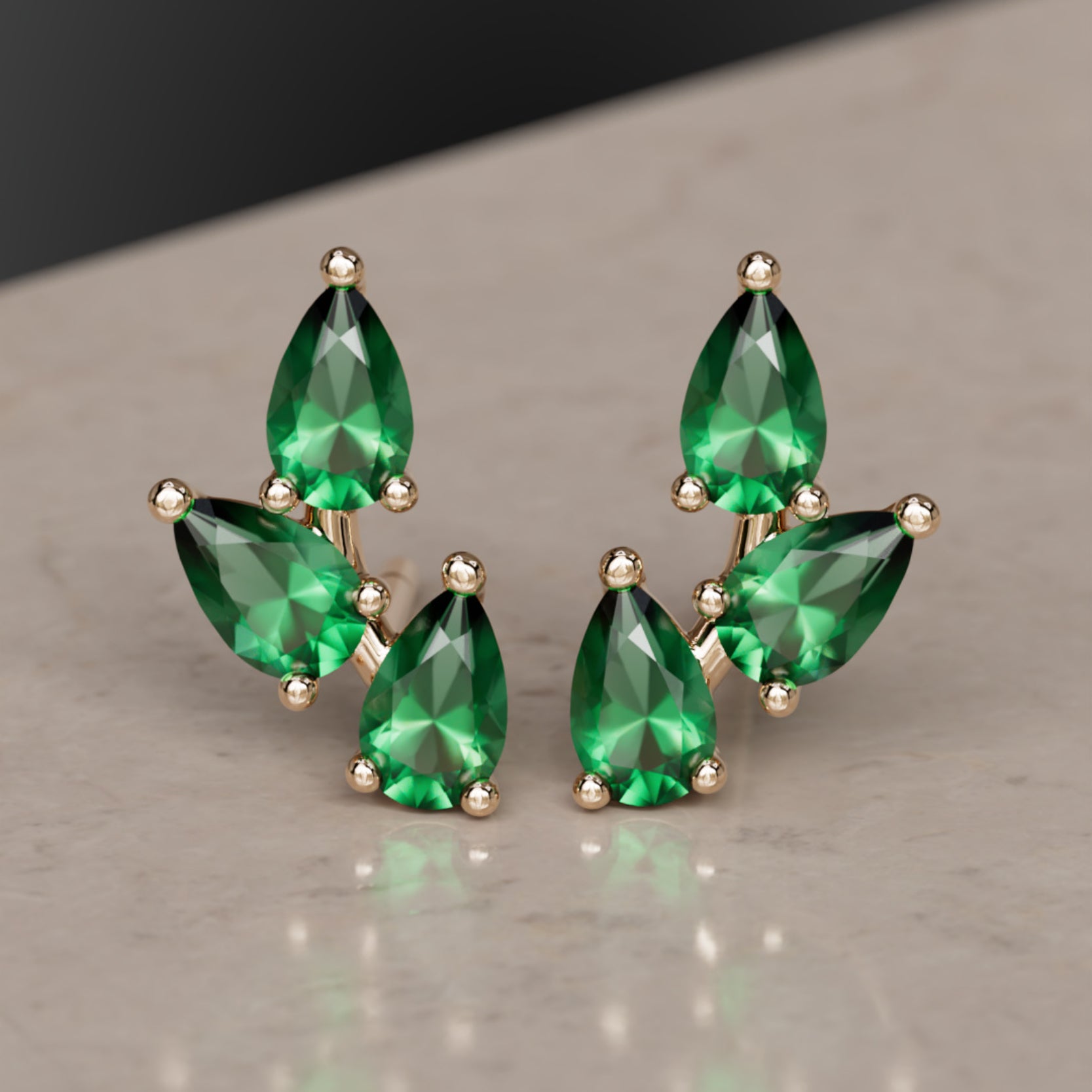 Hruškový výbrus eticky získaných smaragdov vytvára tvar listu v týchto rozprávkových náušniciach inšpirovaných prírodou. Smaragdy sú 4x2.5mm - priemerná hmotnosť 0,12 karátu, celkom 0,72 Ct.