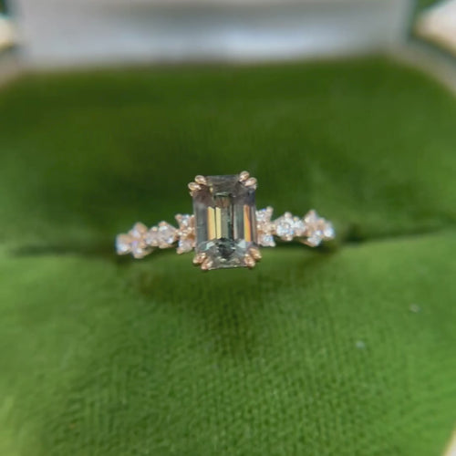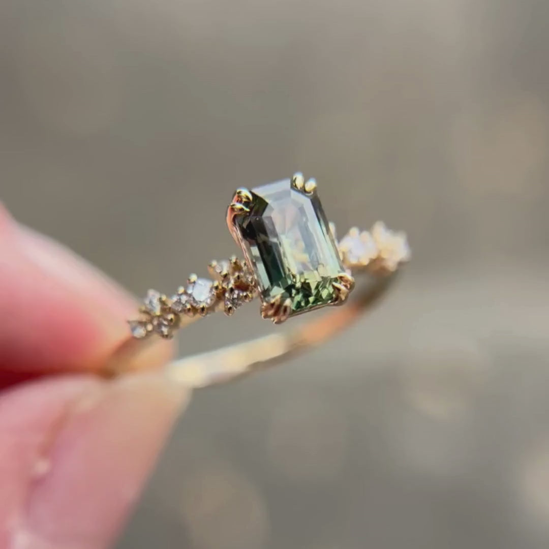 Prsteň Astrid z modrého zafíru je nebeský štýl dizajnu, ktorý obsahuje na mieru získaný emeraldový výbrus zeleného zafíru zdobený zhlukmi hviezdnych drobných diamantov. Tento jedinečný prsteň by bol dokonalou alternatívou zásnubného prsteňa. Stranné diamanty majú veľkosť 1 mm a 1,5 mm G+ VS1+. Stredný zelený zafír v príklade má približne 1 karát.