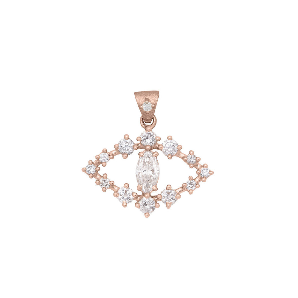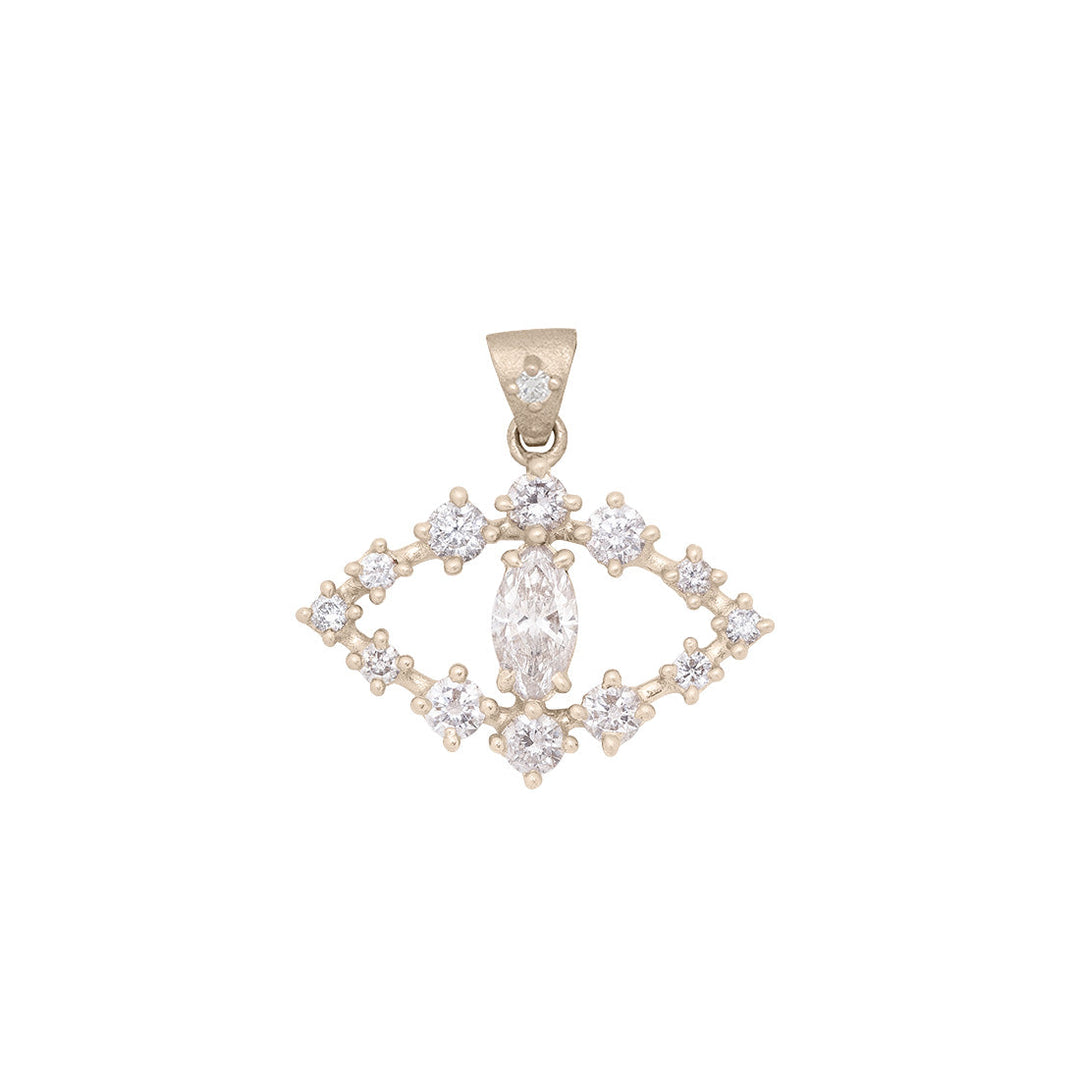 Цей унікальний підвіс у стилі паве з захистом для очей має приголомшливий маркізовий ірис вагою 0,5 карата, що нагадує силует котячого ока. Око — наш улюблений мотив, оскільки це давній і універсальний символ просвітлення або захисту. Виготовлено шляхом ретельного встановлення кожного дорогоцінного каменю в золото та завершено стилізованою підвіскою, прикрашеною діамантами. Підвіска у вигляді ока має розмір 23 мм у ширину та 14 мм у висоту (без підвіски). Загальна вага в каратах: 1,31 Ct, центральний маркізовий камінь — 0,50 Ct G+ SI1+, а дрібні діаманти мають загальну вагу 0,78 карата та чистоту G-I SI (оцінка чистоти та кольору для білих діамантів). Ланцюжок продається окремо