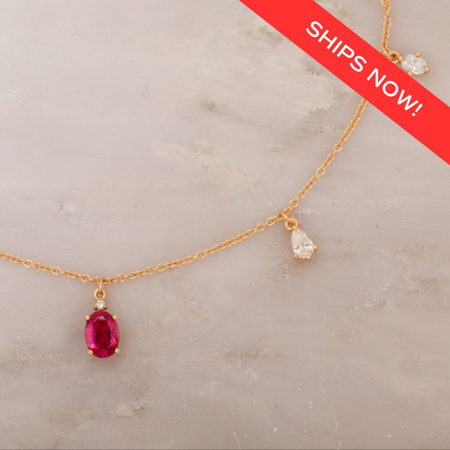 Цирцея, давньогрецька чарівниця, яка могла використовувати силу рослин, надихнула на створення цього намиста з бахромою, що нагадує підвішені квіти. Рожево-червоний полуничний гранат делікатно нанизаний серед грушоподібних та овальних діамантів із блиском. Ніжний рух підвісок створює привабливе мерехтіння з будь-якого кута.
